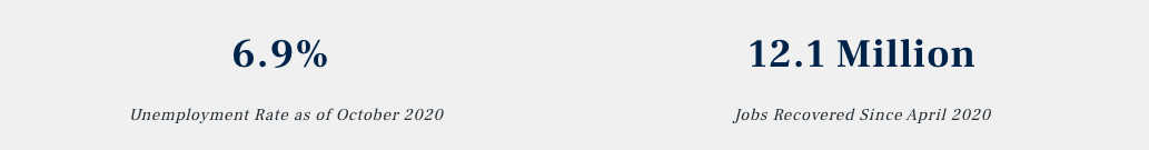 Additional Stimulus Is Critical for 2021 Job Growth. While some races remain undecided, it is clear that neither the Republican nor Democratic Party will hold a strong majority in Congress. This division will likely keep President-Elect Joe Biden from pursuing his full agenda at the outset of his term. Bipartisan support is stronger for small-business stimuli. Additional funding for the Paycheck Protection Program or similar measures is likely to come to fruition within the next 90 days and will be vital, along with an overall health solution, for improving the jobs outlook in 2021.